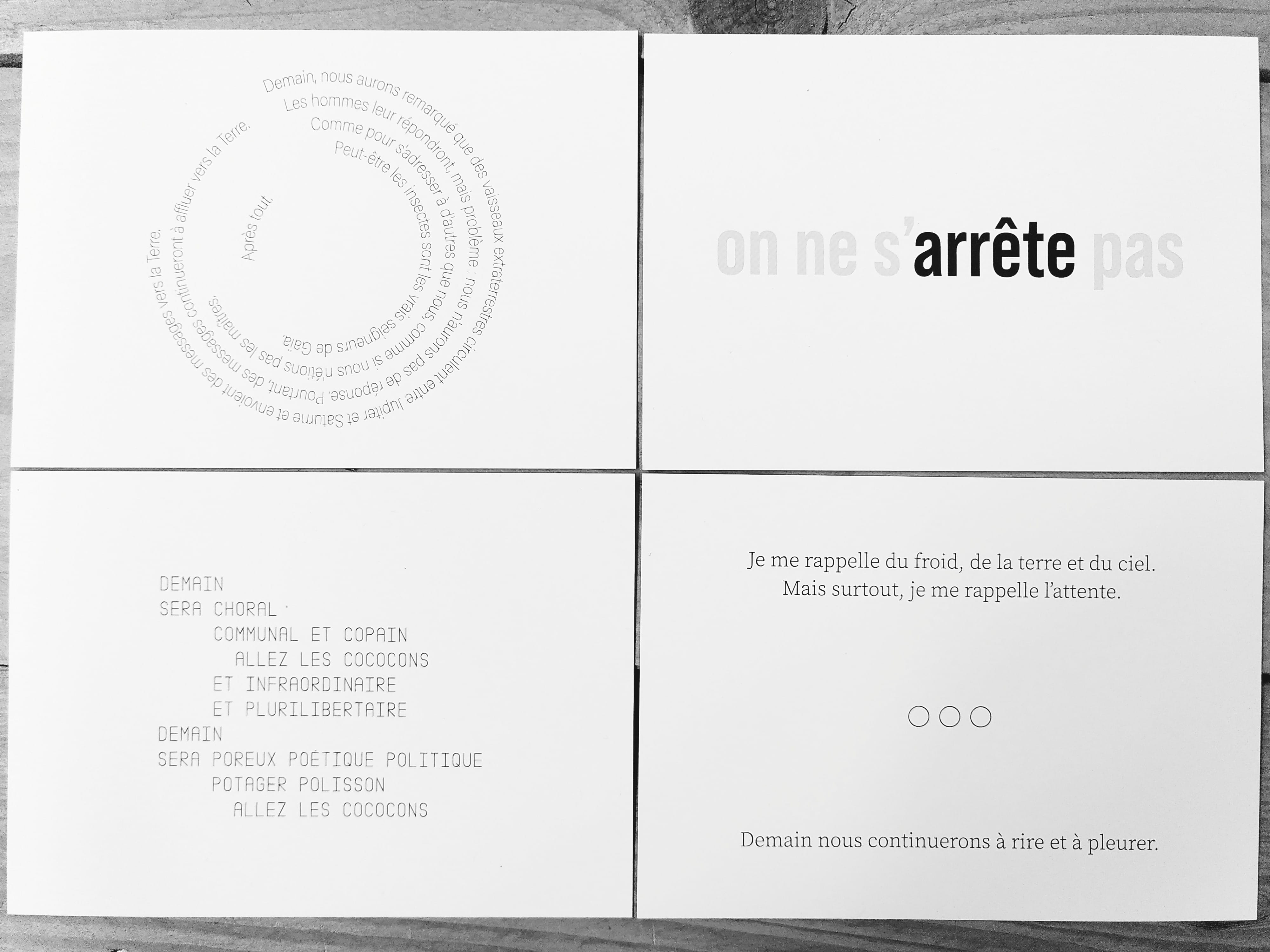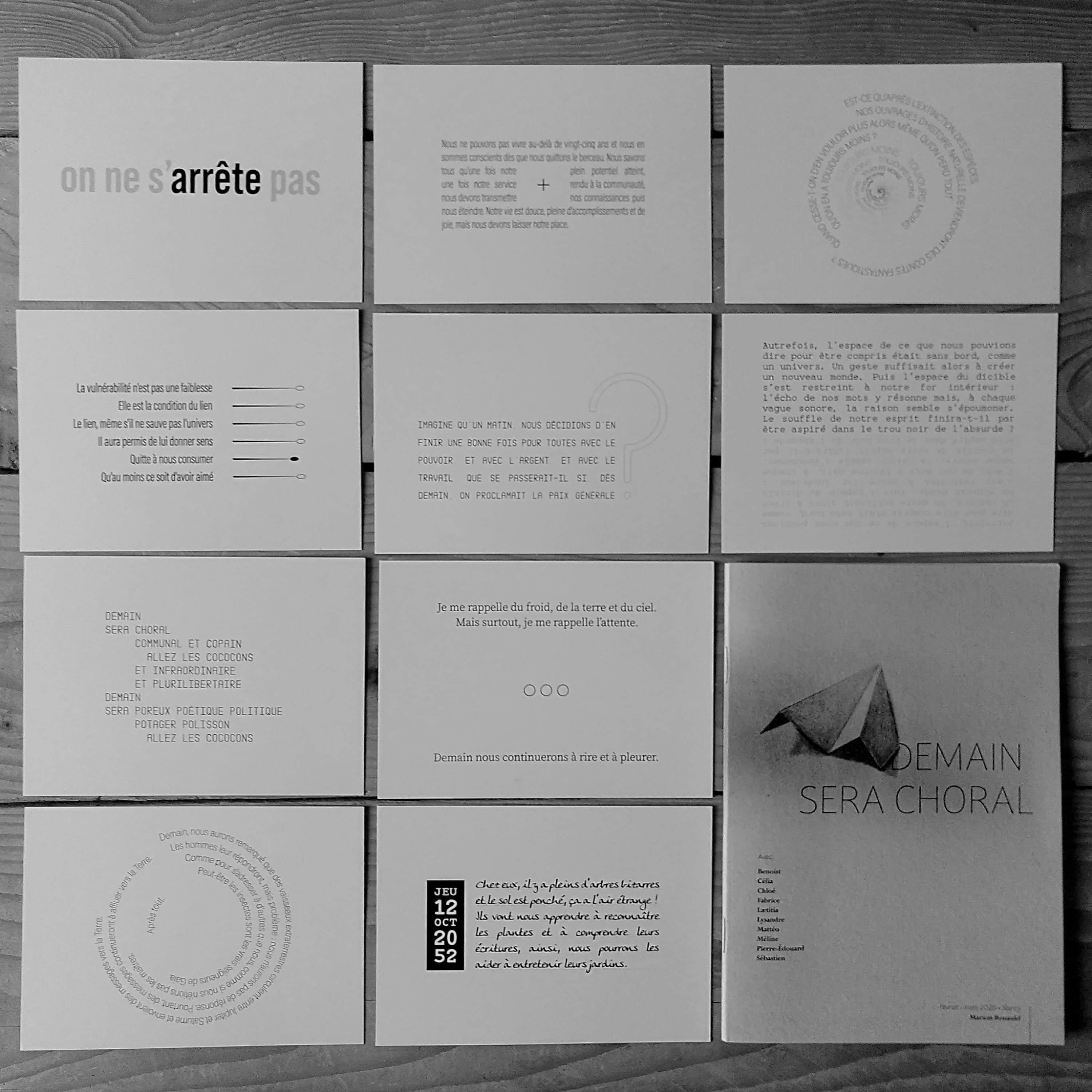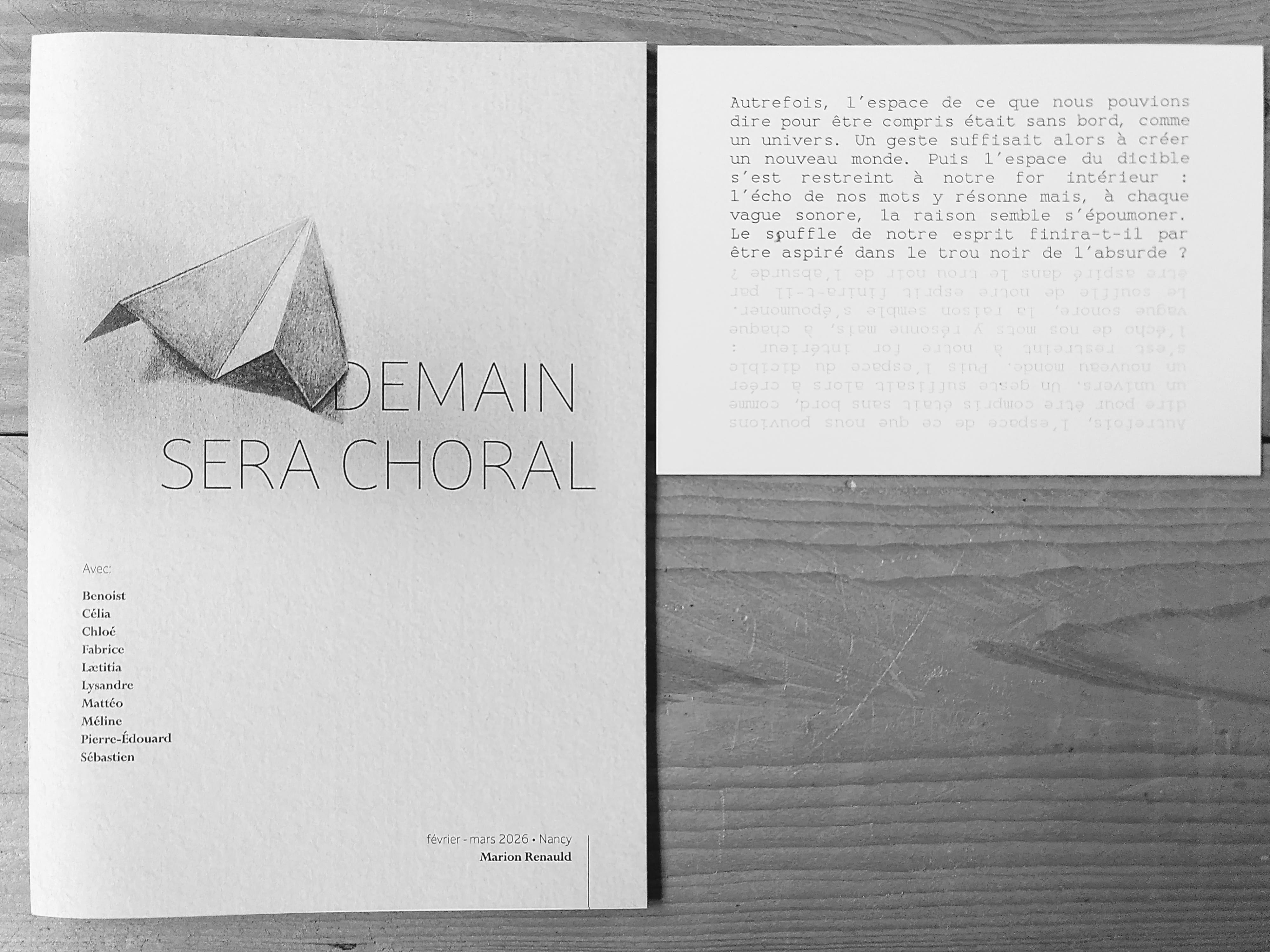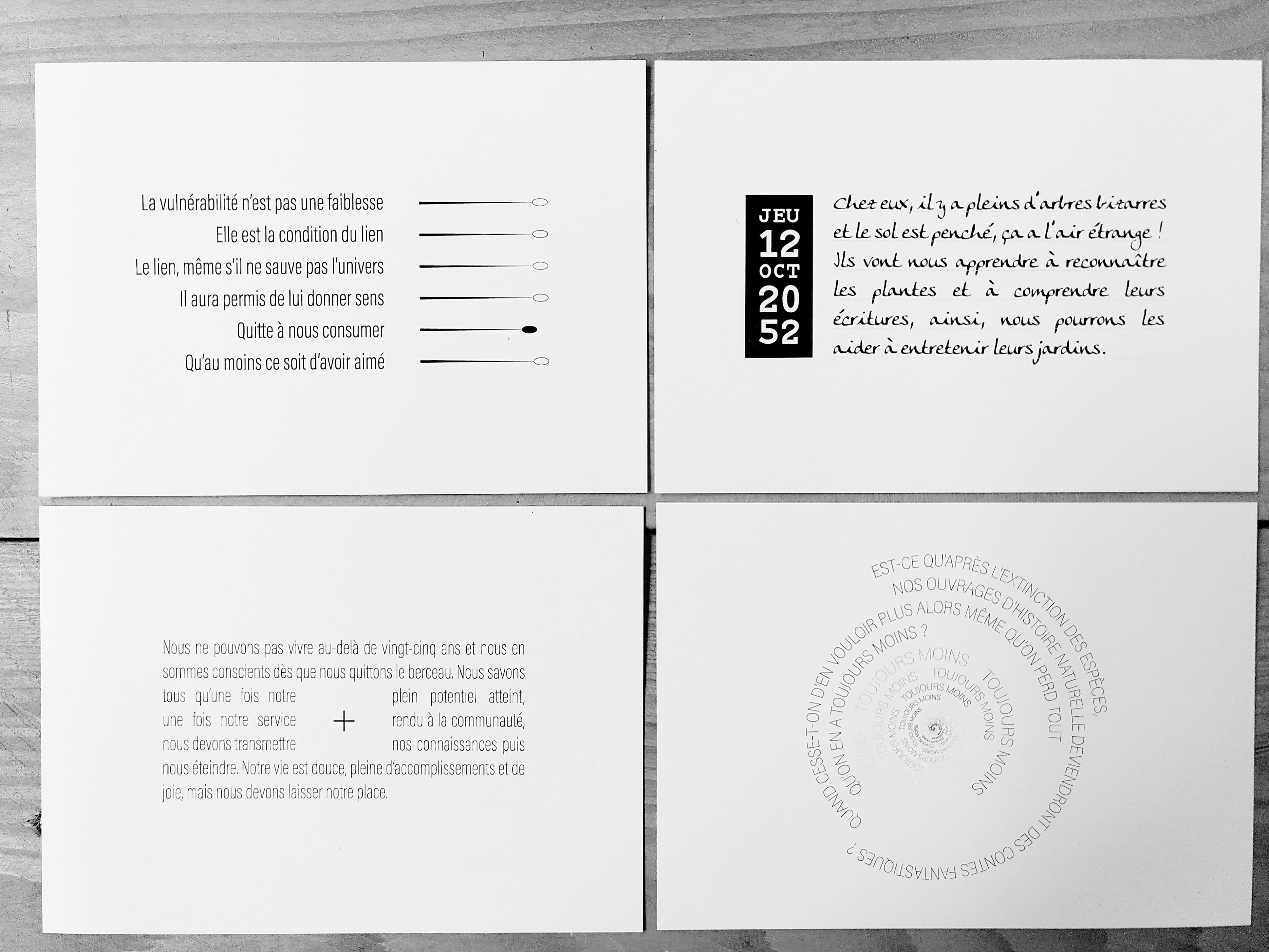 À l’invitation de Pierre-Édouard Bour, 4 séances de 3 heures d’ateliers d’écriture dans le cadre de Philosofictions, une action de médiation portée par le laboratoire Archives Henri-Poincaré, Philosophie & Recherches en Sciences et Technologies. On est 10, on réfléchit et on raconte demain. On lit un peu, on se lit pas mal, on se lie. À la fin on aura joué toute une chorale devant quelques humains. Et en plus, tu peux prendre gratos le livret et une série inédite de 9 cartes postales faites par Accolade. Comme ça on peut envoyer l’inconnu à des inconnu.e.s.