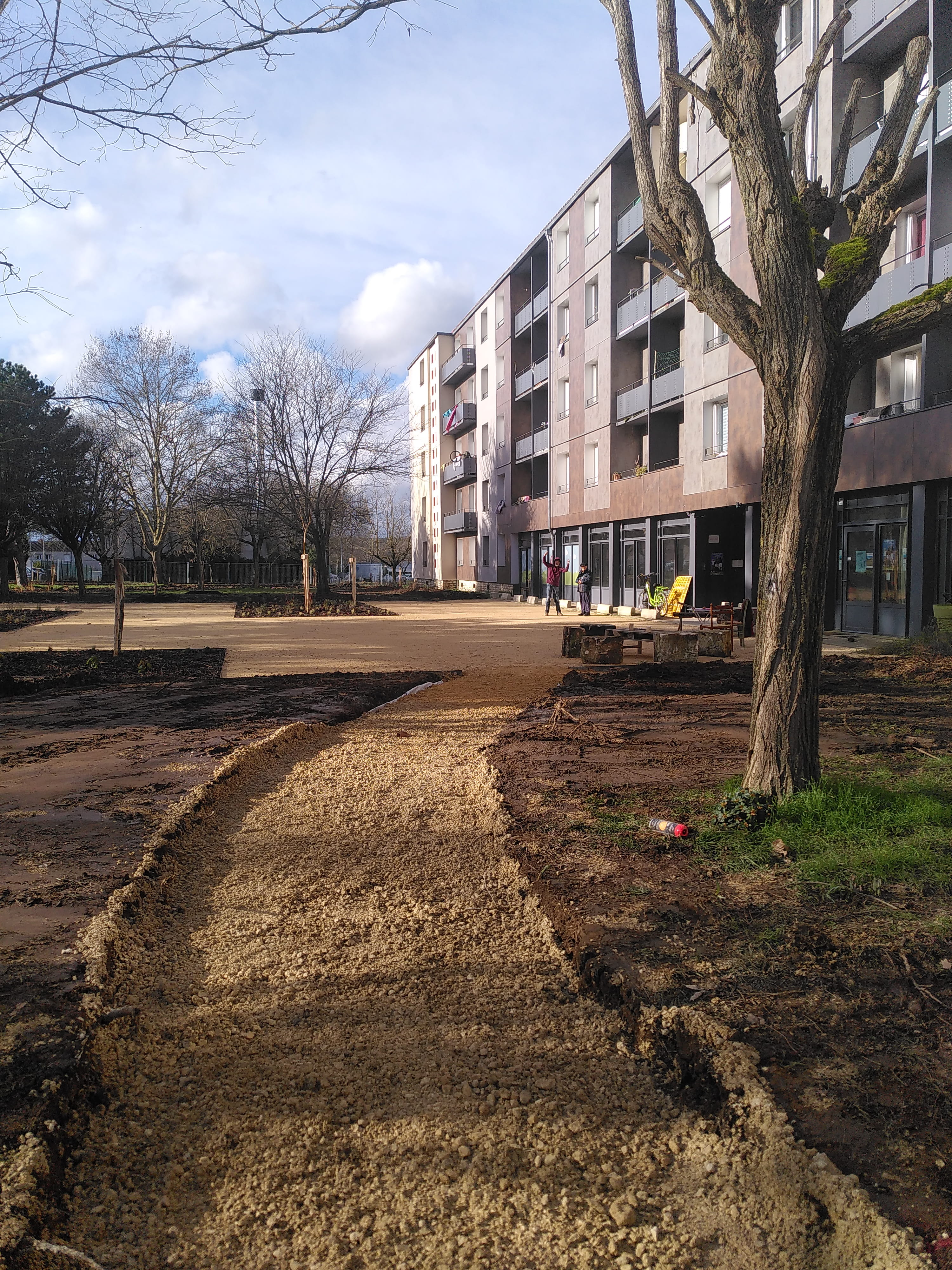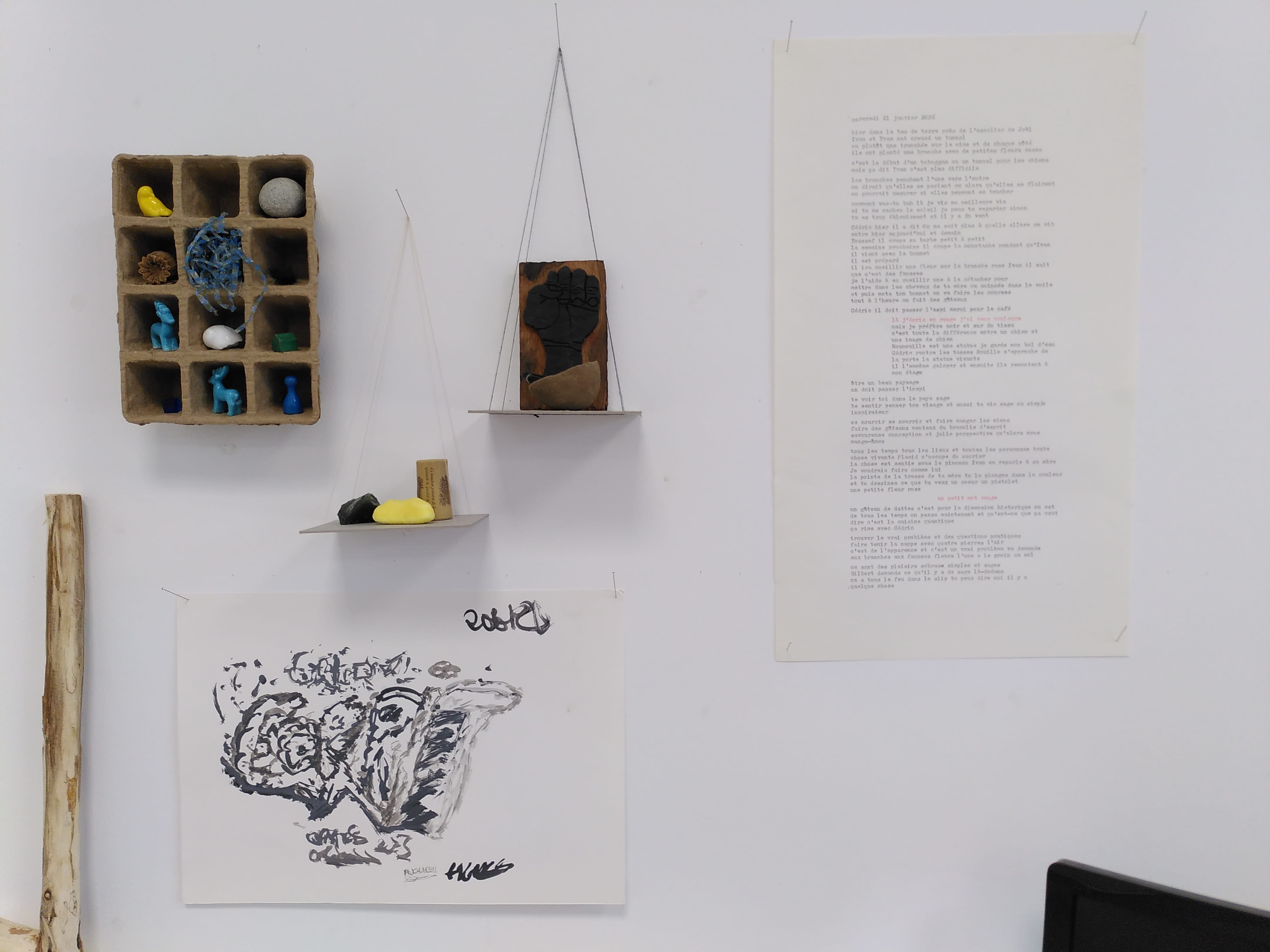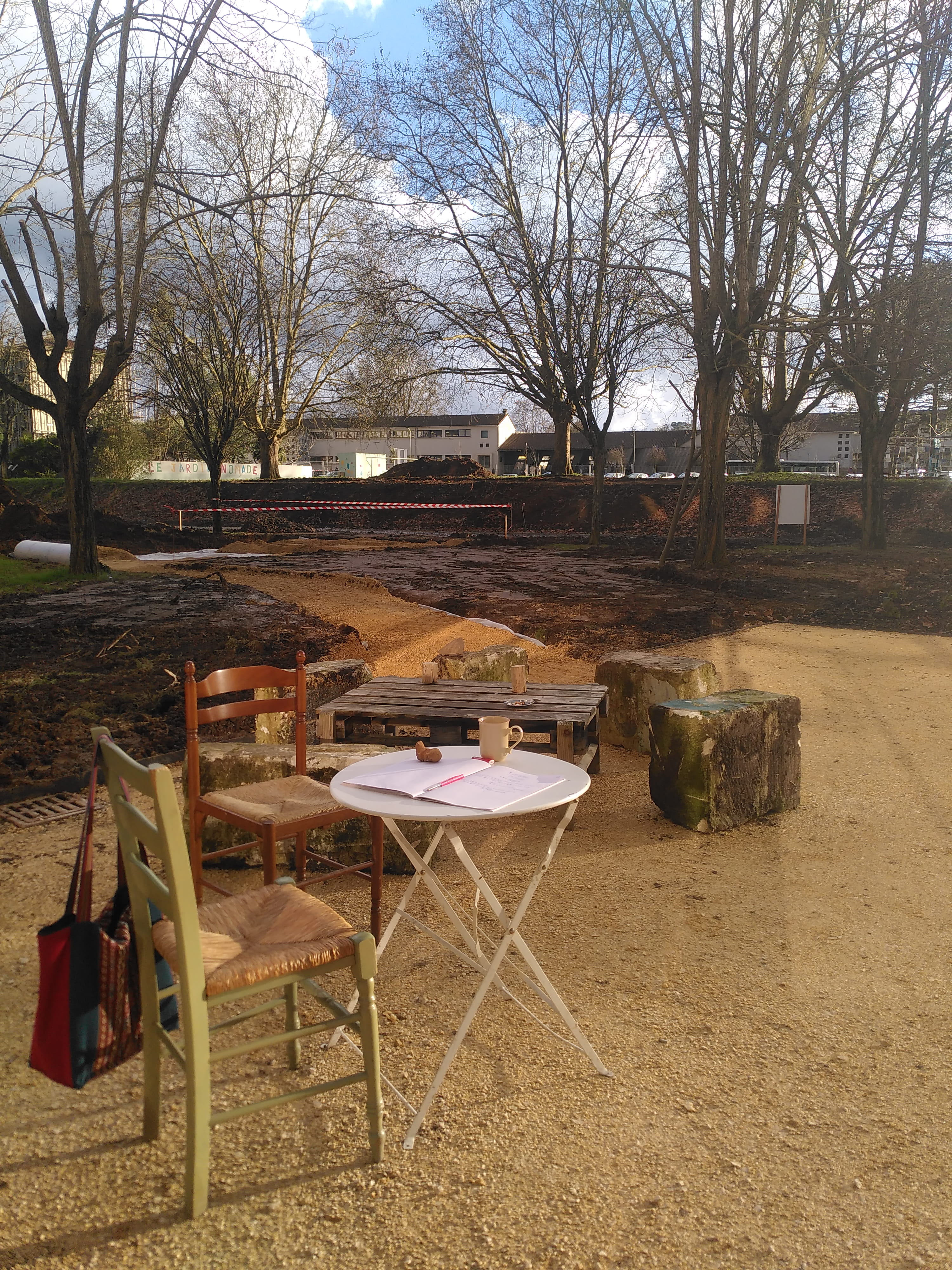 Nouvelle semaine de résidence improvisée à la Cité Jacqueline Auriol de Coulounieix-Chamiers, avec Placid, Marc Pichelin et un peu Joël Thépault. Tandis que l’aménagement des espaces verts a largement commencé, à l’intérieur du Cockpit, désormais ouvert tous les après-midis du mardi au vendredi jusque juin grâce à Claire, la nouvelle stagiaire, se déroule entre autres une sorte d’atelier de couture libre et invitant. Tu es dehors et tu écris à la main au crayon bleu dans un cahier, puis un autre. Certain.e.s y écrivent aussi, ou dessinent. On croirait une performance sans fin, une création chorale, une photo-écriture de poésie vivante. Parce qu’il est clair que l’art participe de la transformation sociale et intime. Et que vu la dose de disharmonie globale, autant épaissir nos petites densités, et sensibles et pensibles.