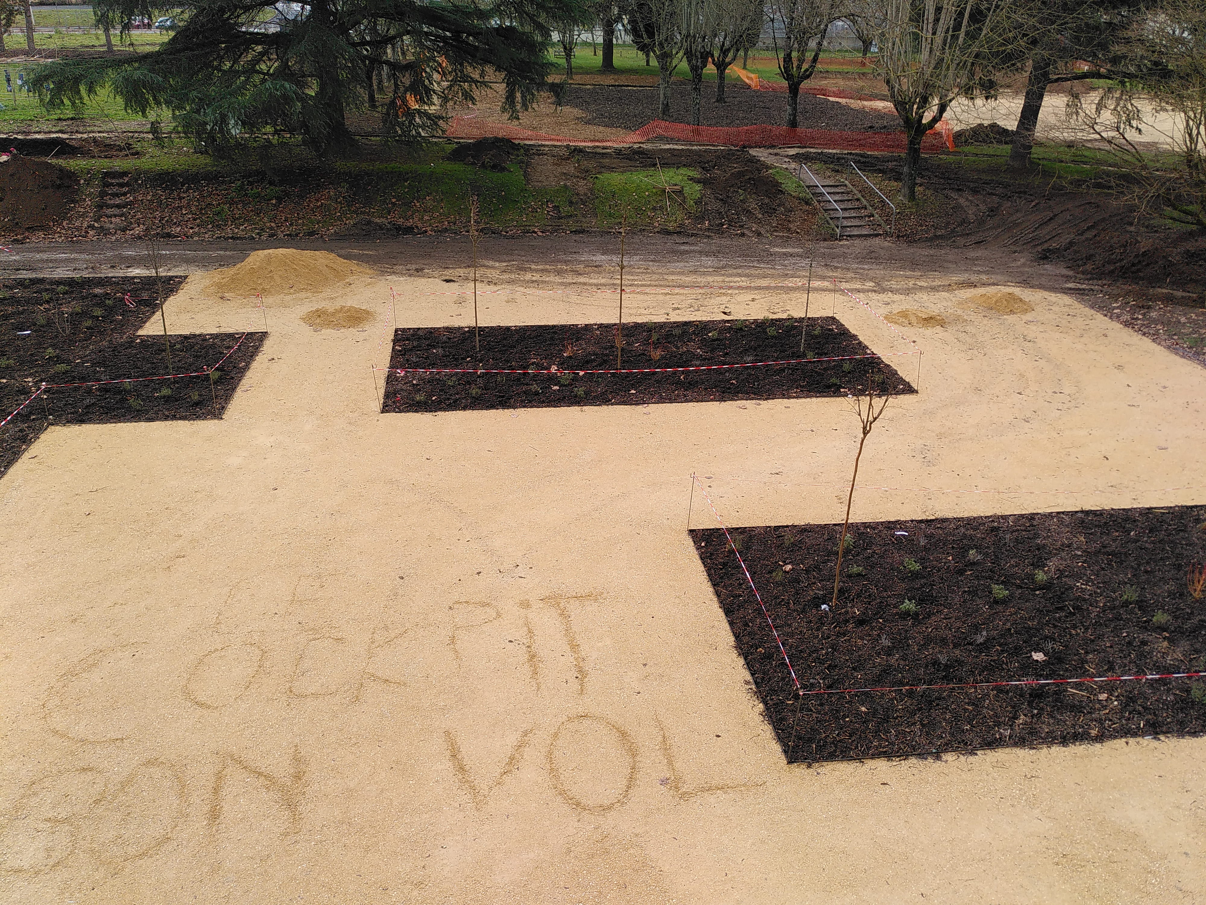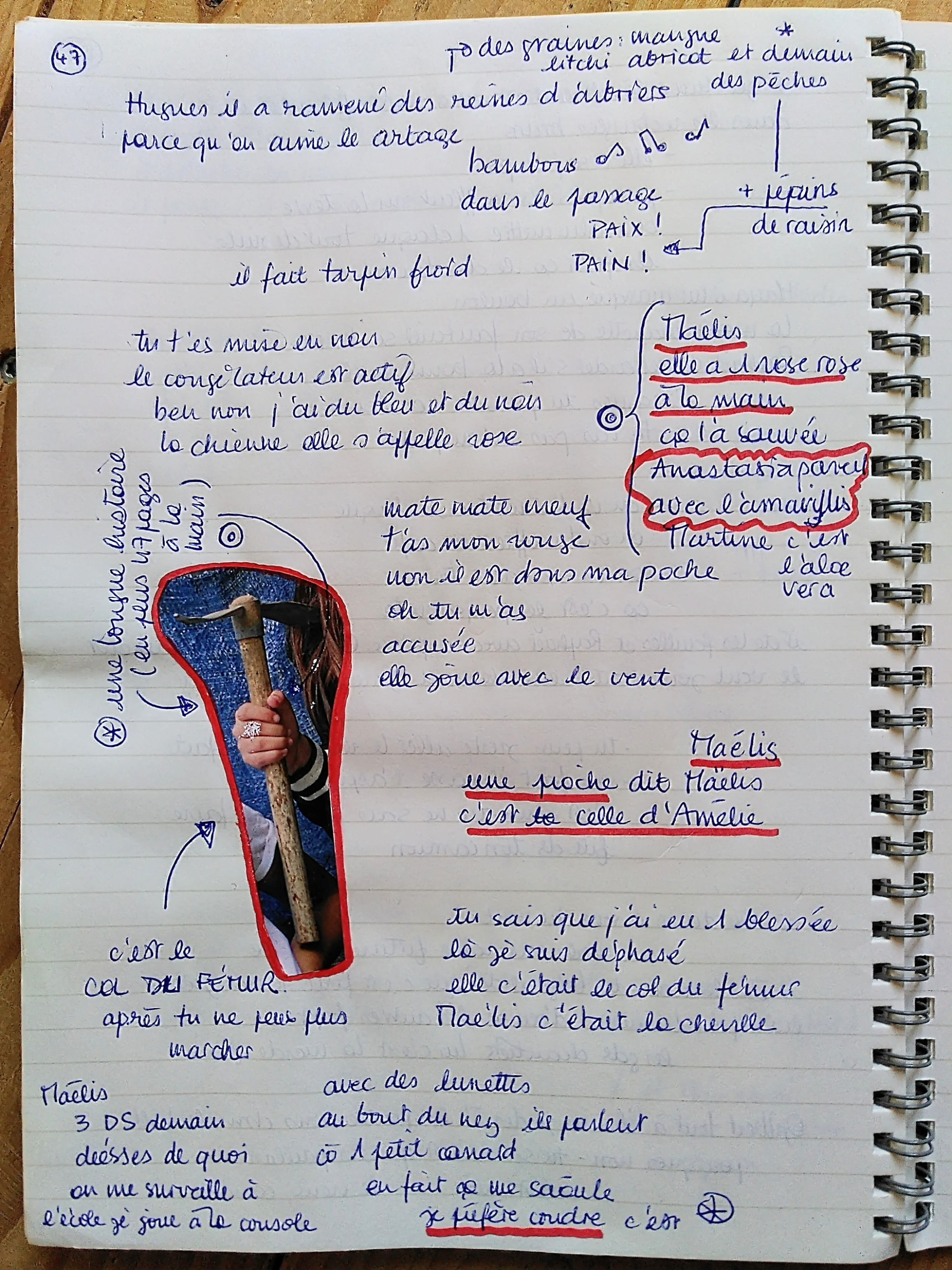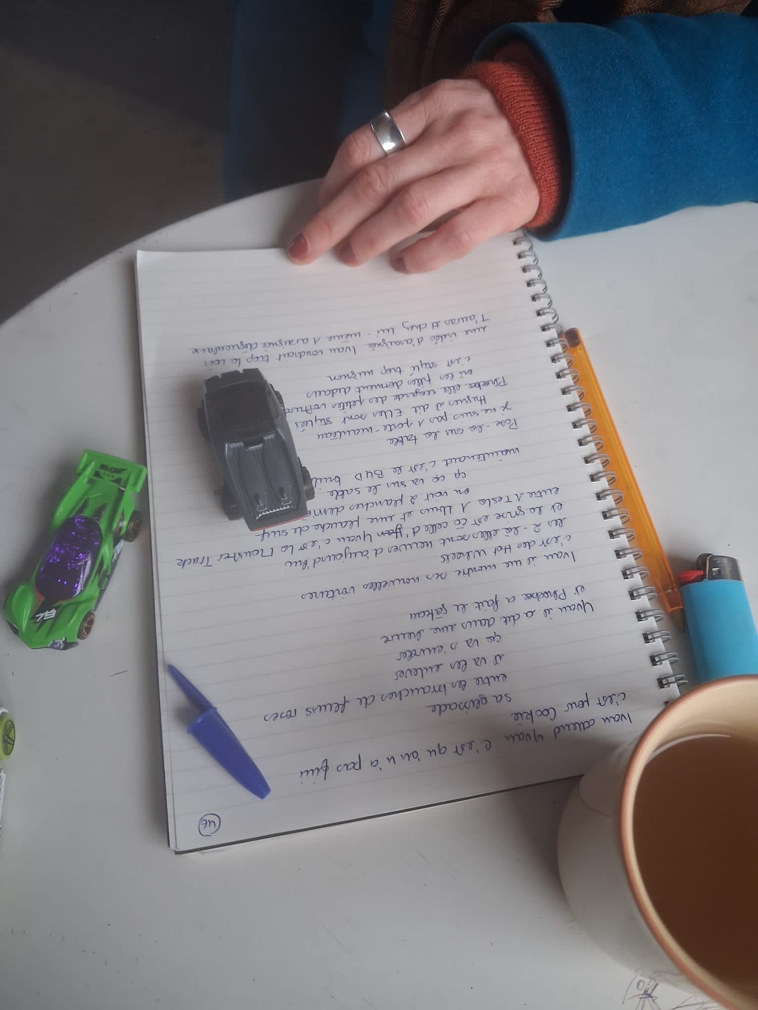 Nouvelle semaine de résidence improvisée à la Cité Jacqueline Auriol de Coulounieix-Chamiers, avec Placid, Marc Pichelin et un peu Joël Thépault. Tandis que l’aménagement des espaces verts a largement commencé, à l’intérieur du Cockpit, désormais ouvert tous les après-midis du mardi au vendredi jusque juin grâce à Claire, la nouvelle stagiaire, se déroule entre autres une sorte d’atelier de couture libre et invitant. Tu es dehors et tu écris à la main au crayon bleu dans un cahier, puis un autre. Certain.e.s y écrivent aussi, ou dessinent. On croirait une performance sans fin, une création chorale, une photo-écriture de poésie vivante. Parce qu’il est clair que l’art participe de la transformation sociale et intime. Et que vu la dose de disharmonie globale, autant épaissir nos petites densités, et sensibles et pensibles.